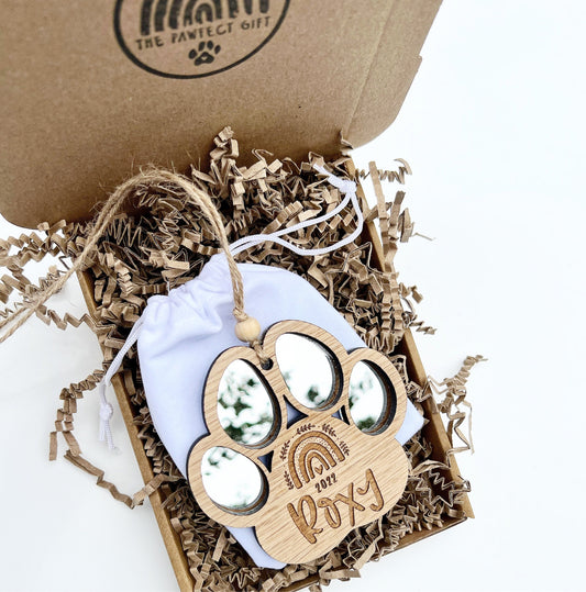 Personalised silver mirrored dog paw decoration, Christmas dog memorial decoration, Dog memorial Christmas ornament, Custom dog ornament