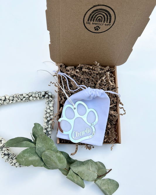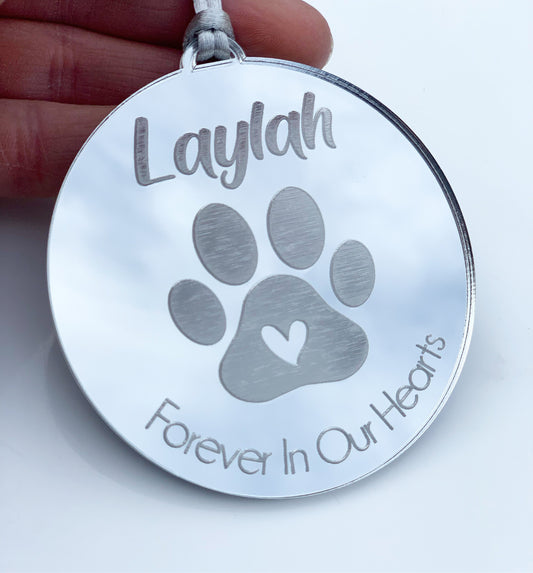 Personalised silver mirrored dog paw decoration, Christmas dog memorial decoration, Dog memorial Christmas ornament, Custom dog ornament