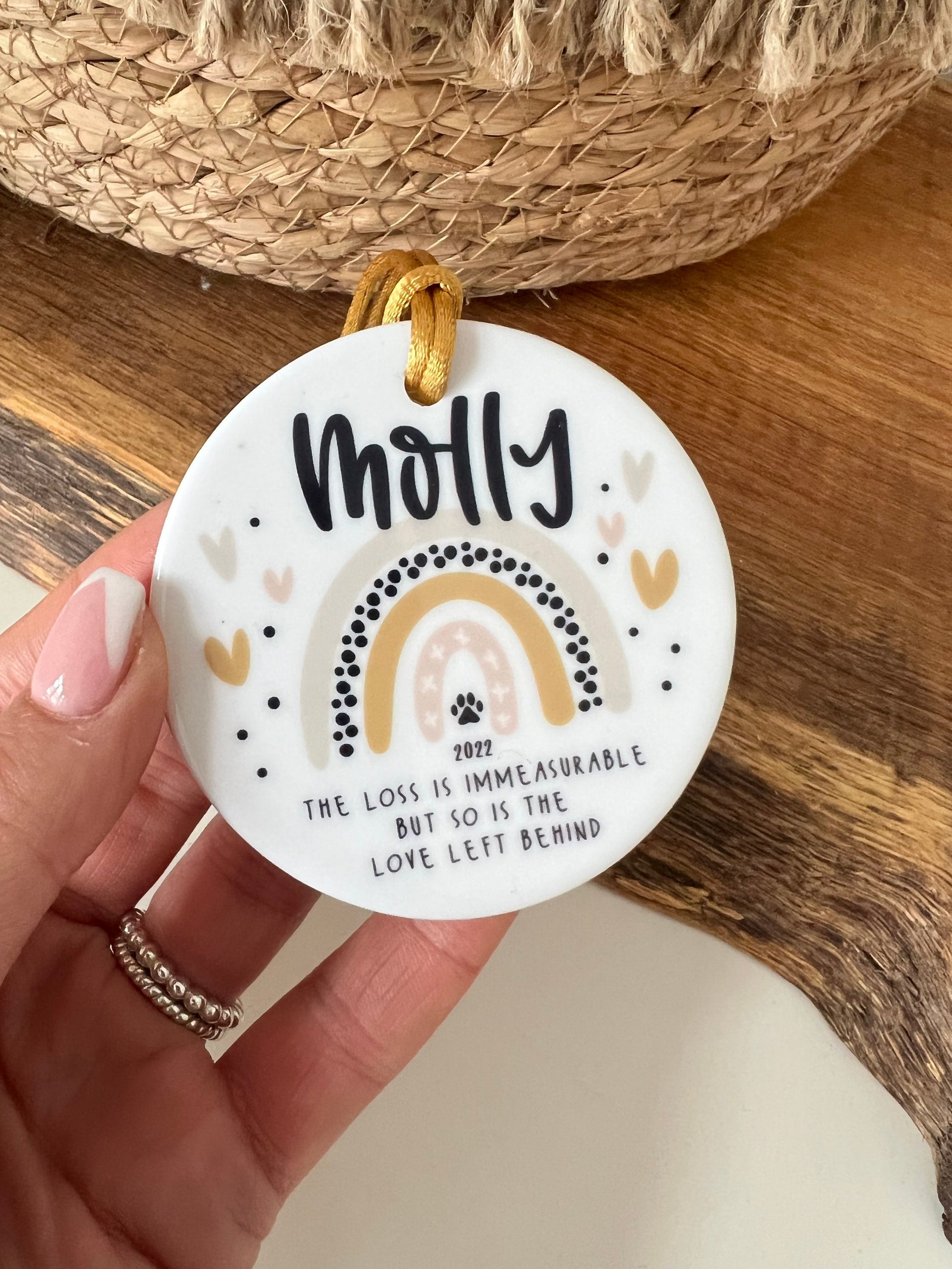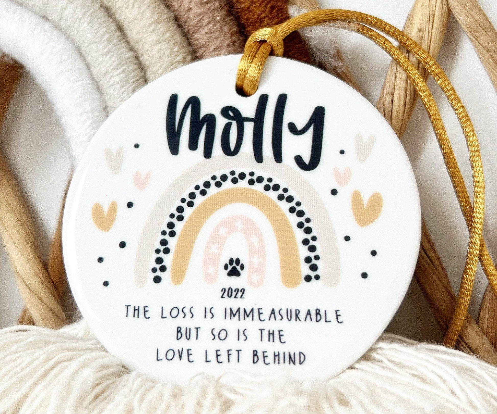The most PAWFECT ornament to commemorate your fur baby! Each ornament is directly printed onto a high quality white ceramic disc, finished off with gold cord.