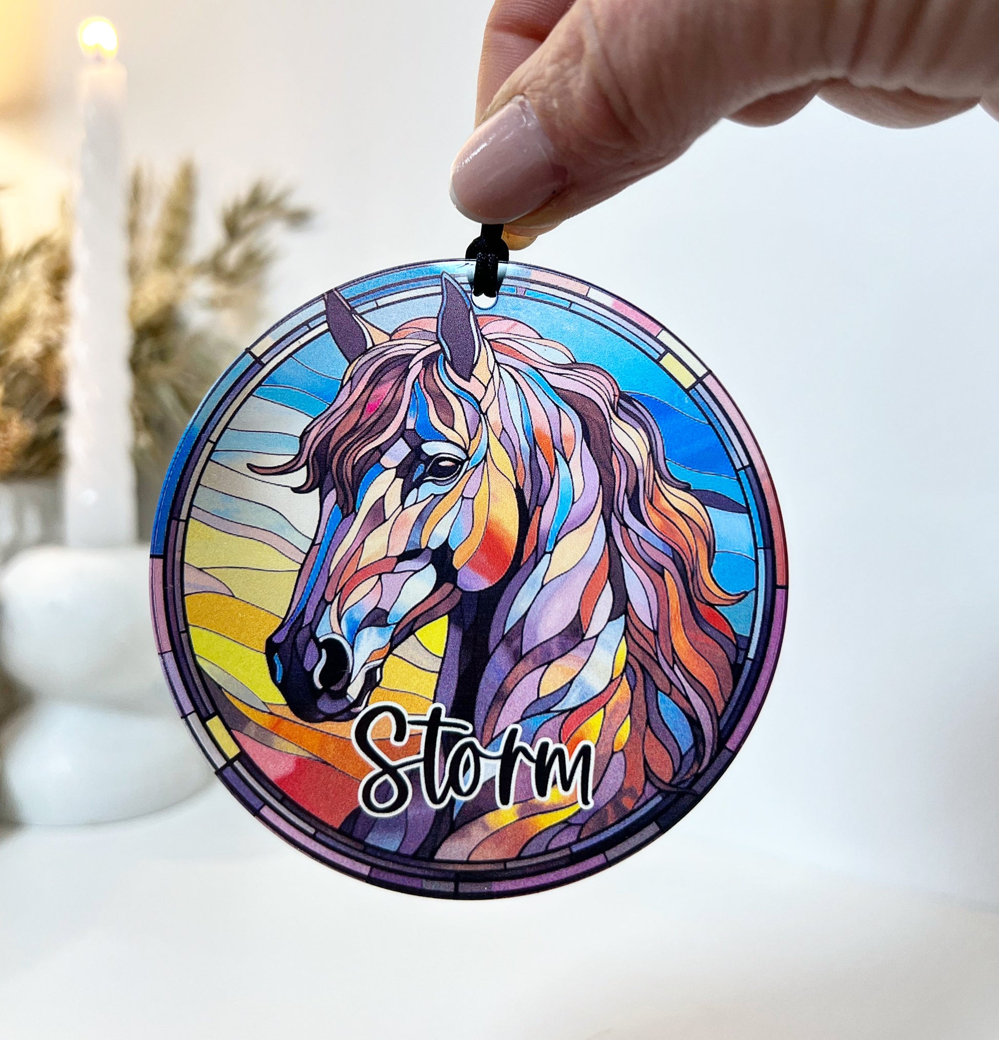 Honour the memory of your beloved horse with our personalised stained glass effect memorial ornament.